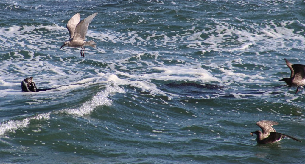 On a recent visit to Monterey, we saw gulls successfully stealing food from the otters as they were preparing to dine. Using their armpits as pockets, sea otters stash abalone, crabs, clams, mussels and urchins, and use rocks to crack their food open once they get back to the surface.