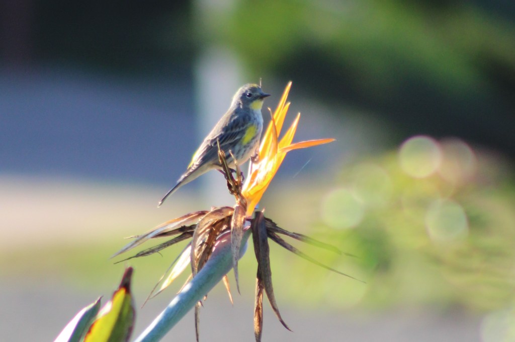 Spotted on a bird-of-paradise blossom, this sparrow-sized bird is a year-round resident of Southern California. Cornell University’s All About Birds website indicates that Yellow-rumped Warblers eat insects and berries. Their stout beaks probe for insects and pick berries from stems. In fact, the species’ appetite for berries “when no insects are available enables them to winter farther north than those warblers that are strictly dependent on insects” (K. L. Garrett and J. B. Dunning Jr, authors of the Wood Warblers section of The Sibley Guide to Bird Life & Behavior, pp. 499-500 of 1st edition). Their digestive systems are unique among warblers in their ability to eat both insects and berries.
