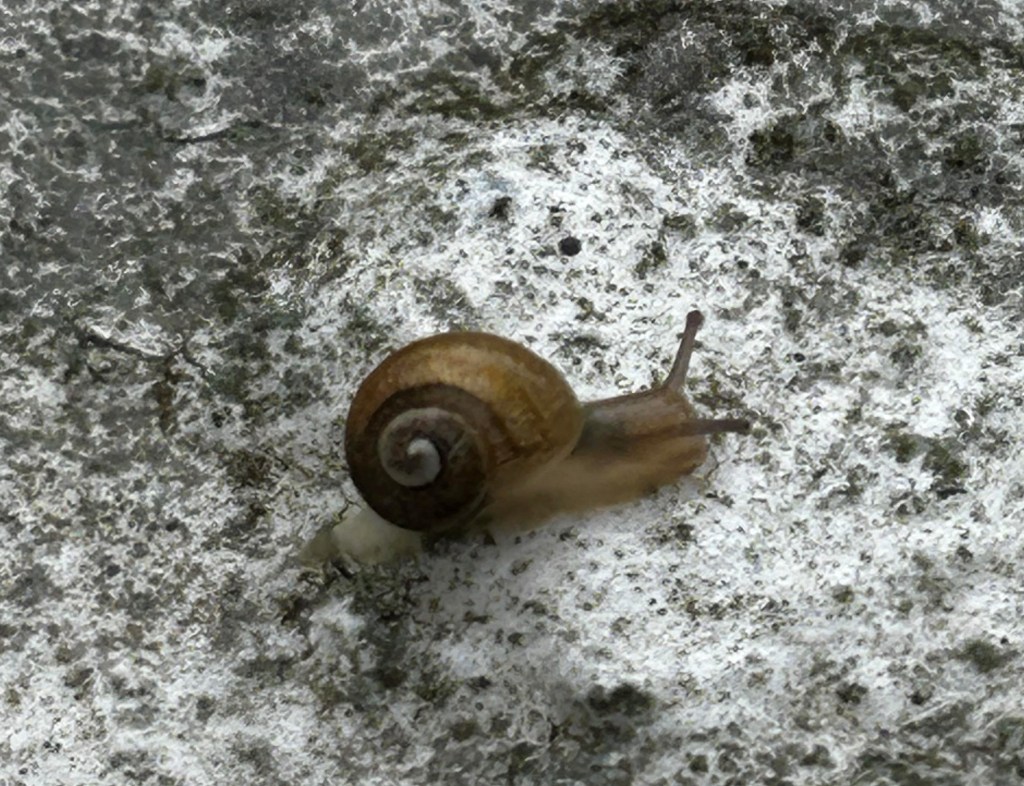~It’s also been a very good day for juvenile snails. It’s as if they’ve been hiding away in moist crannies, waiting to leap off the casting couch onto the stucco and cement surfaces and rasp their way to adulthood. This one is about an inch from the eyes on the top of the tentacles to the end of the foot.