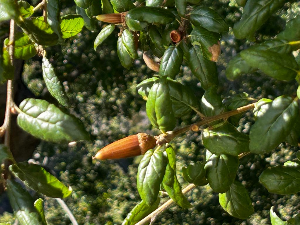 The Coast live oak is classified as an evergreen. Its lush green leaves are 1 – 2.5 inches long and spiny, bringing to mind holly branches. One could say it is the Southern California tree companion to the Giant Redwoods and Sequoias of Northern California’s coast. All enjoy coastal fog and tolerate fires well.