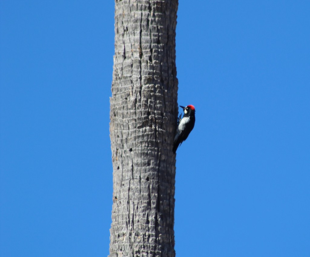 There are several Coastal Live Oak trees nearby (seen below and left of the fan palm in this picture), giving them easy access to acorns. However, these birds eat more than their name suggests.