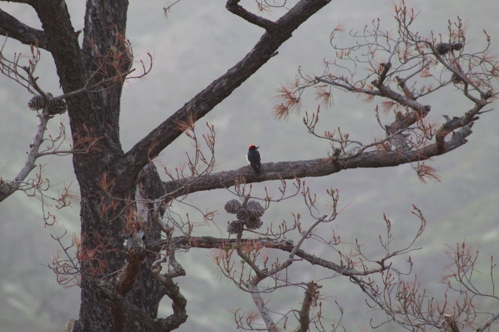 Acorn Woodpeckers are finding new perches in the burned pine tree.