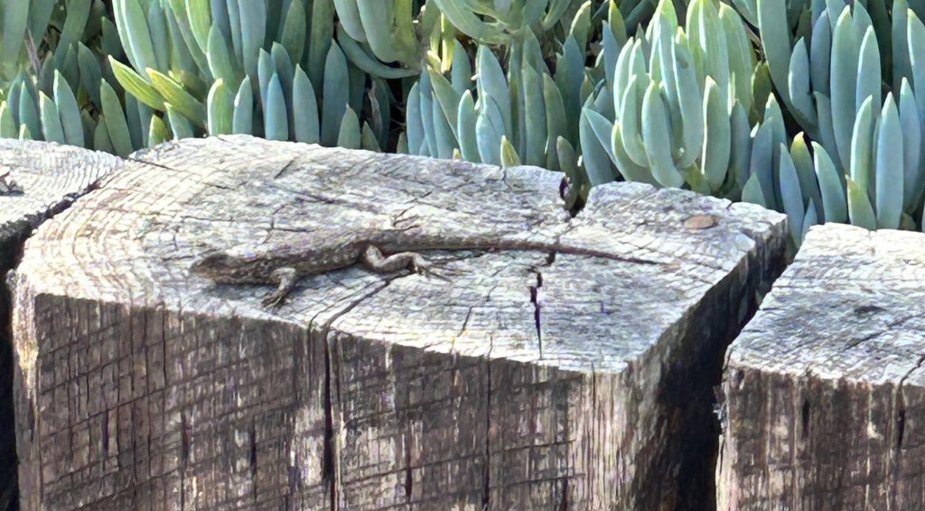 Western Fence Lizards have new babies scampering around the plants.